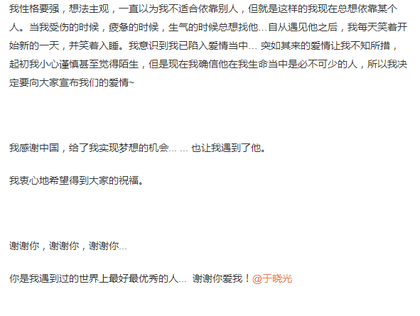 在两个人公布结婚前,也出过一次幺蛾子,于晓光被拍到晚上与一位女性十指紧扣出街,被指出轨,之后于晓光回应两人只是同学关系。
