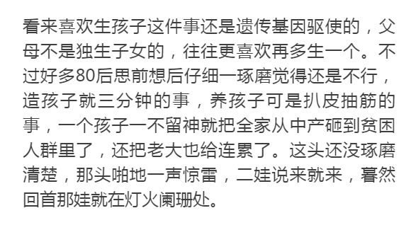 第三境界就是我们这一辈了,赶上好时候,国家开放二孩了。其实双独一直以来都允许生二娃,2013年又开放了单独二娃指标,只是这一届70、80后普遍觉悟不够,积极响应的并不多。自从2017年全面开放二孩政策之后,轰得一下!突然间,中年妇女们肚子都挺起来了。