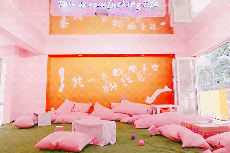 二楼就厉害啦!有个粉色密室,要跟店员说暗号,得到密码才能进。但一进来,就是另一个暧昧的世界...