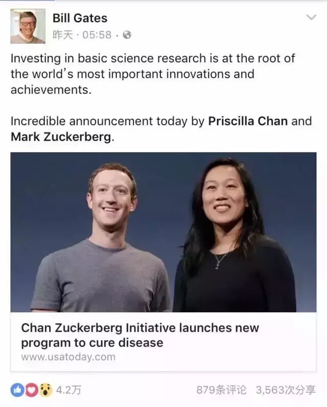 2016年9月,夫妇俩宣布,要通过基金会在未来10年将投入 30 亿美元研发和医学有关的器械用来治愈人类所有的疾病,让下一代健康生长。比尔盖茨参加了新闻发布会,并转发助力。