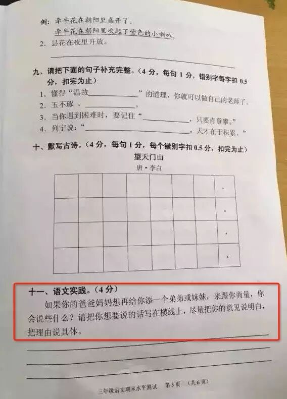 近日,广州天河区小学三年级语文期末考试出了一道实践题
