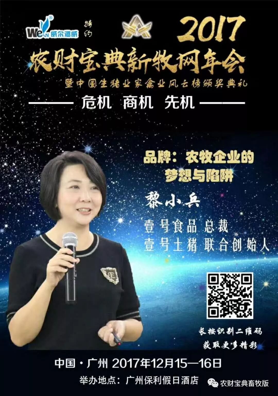12月15-16日,威尔潞威特约2017农财宝典新牧网年会暨中国生猪业家禽业风云榜颁奖典礼即将在广州举行。壹号食品美女总裁黎小兵女士将现场分享壹号土猪打造的秘诀和农牧企业创建品牌的理念。