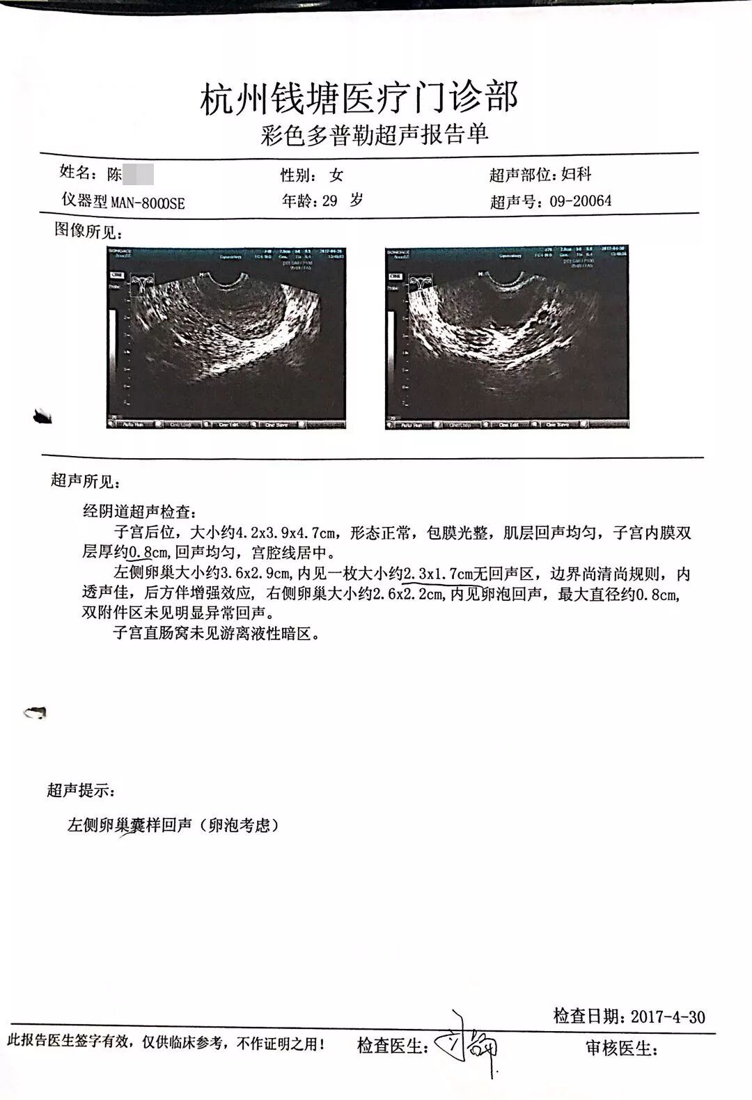 陈女士4月30日于我院进行彩超检查,提示:左侧卵巢囊样回声(卵泡考虑)。