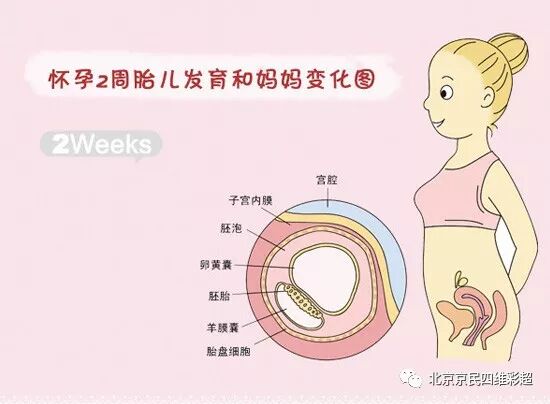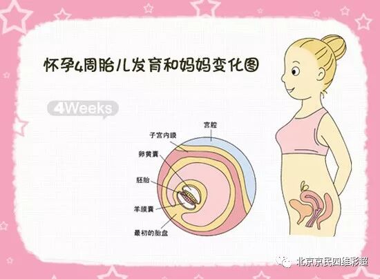 怀孕第四周表示受精卵着床后,羊膜腔形成了。胎儿长度仅为0.2厘米,柔软且轻。此时的胎儿只有两层组织,之后他所有的器官、组织都靠这些组织发育形成。最初的胎盘细胞着床在子宫内膜上,开始为胎儿血液提供并制造空间。