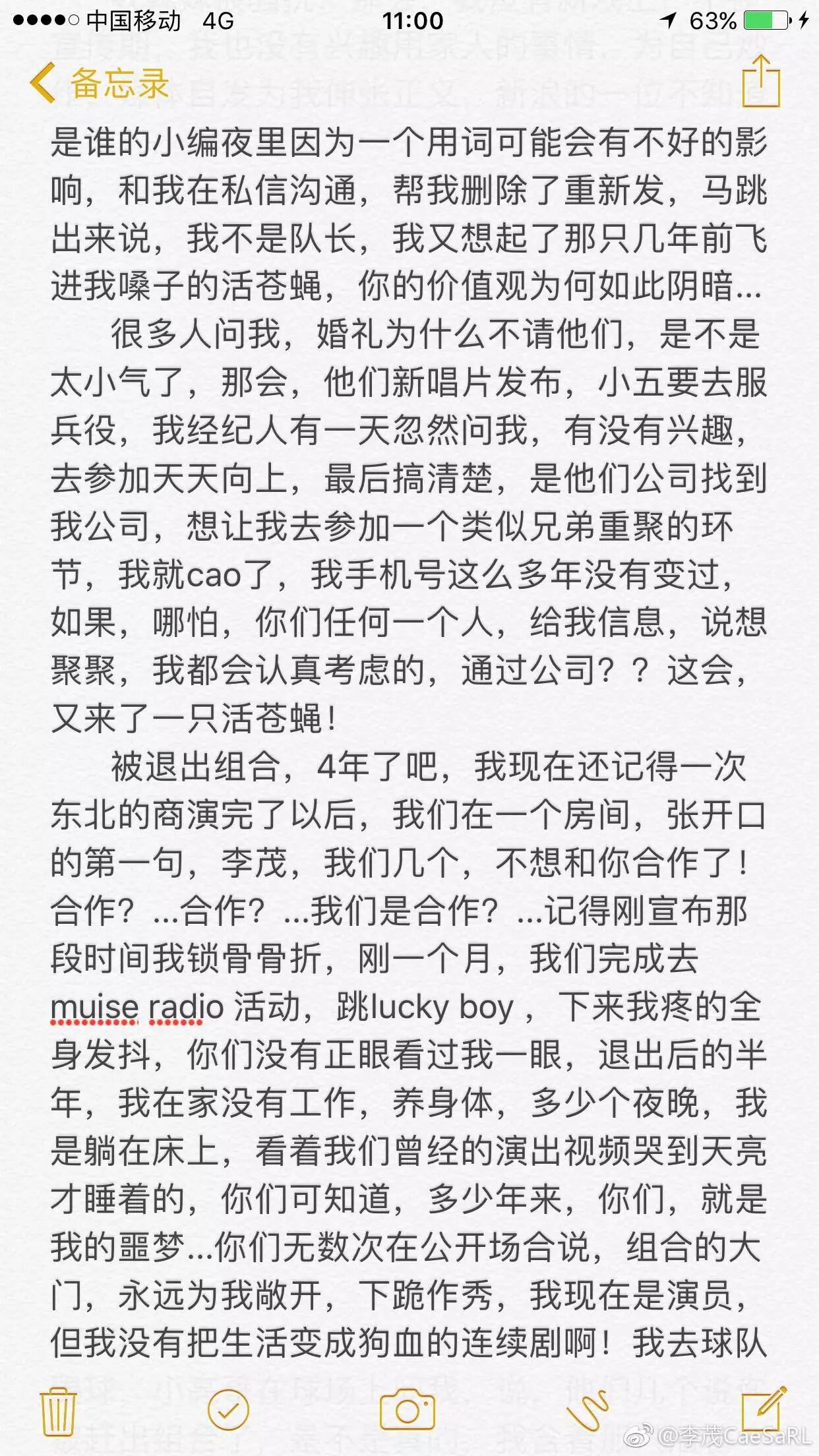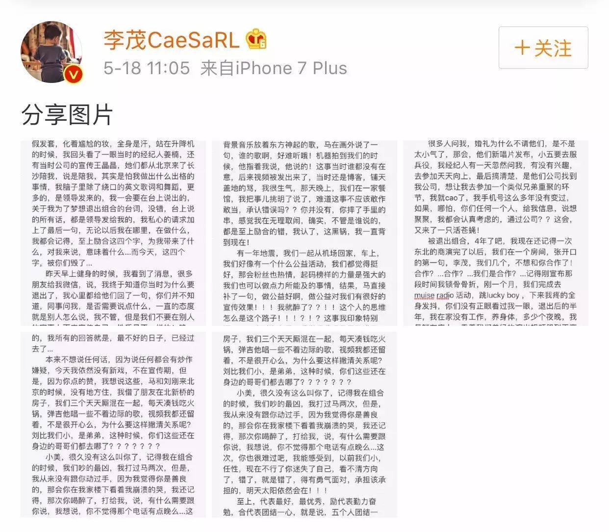 长篇大论中还提到了为什么结婚不请成员们,还拒绝了《天天向上》兄弟特辑的录制,讲述了组合内部各种撕X大战。