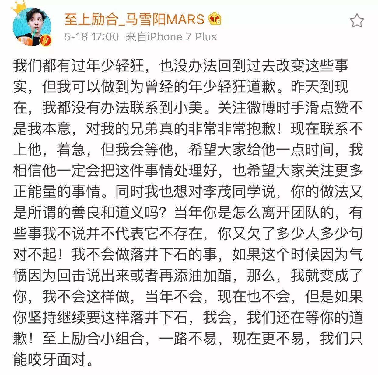 李茂当然不能忍气吞声,微博立刻发声:你们四个千万一句对不起!称自己被赶出团队,和马雪阳积怨已深。