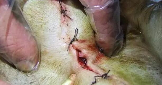 网友既伤心又愤怒,此时的狗狗已经无法站立,他赶紧把狗狗送到医院,医生在查看狗狗伤口时很震惊,缝合的针线十分杂乱,而且也并非专用的!