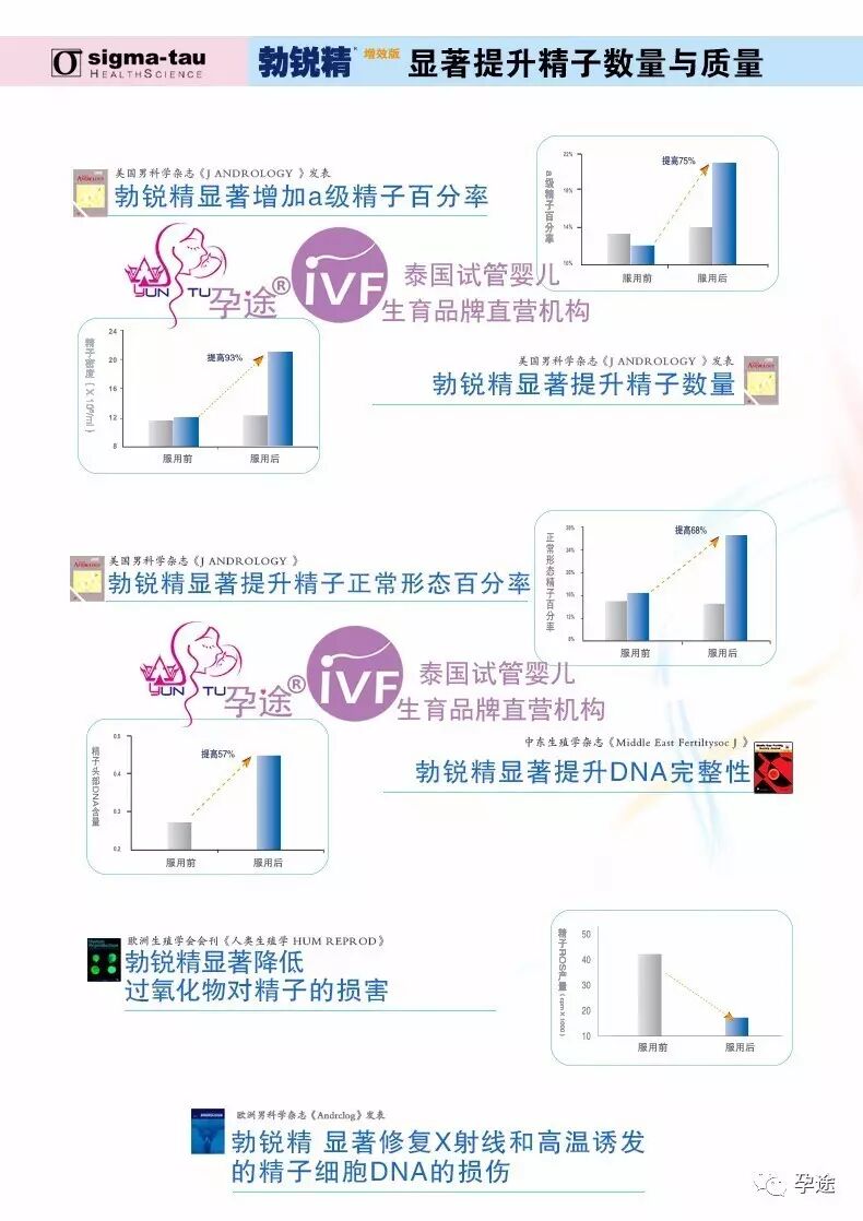 勃锐精男用版在能够显著增加精子数量,提高精子浓度,提高a级精子和正常形态精子百分率的同时,也能显著提升精子DNA的完整性,从而有效提升试管婴儿的成功率。