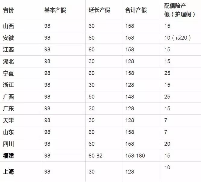 除了产假,在男方的陪产、护理假方面,目前以广西和宁夏最多,均有25天假。除这两地外,四川省规定,男方有20天护理假。山西、江西、广东、湖北、浙江、福建规定男方有15天的陪产假,天津、山东明确男方有7天护理假。安徽则规定,男方护理假为10日,但若夫妻双方是异地生活有20日假期。