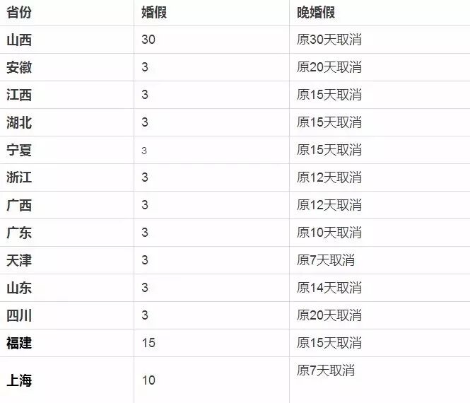 安徽、江西、广西、广东、湖北、天津、浙江、宁夏、山东、四川婚假仍为3天。