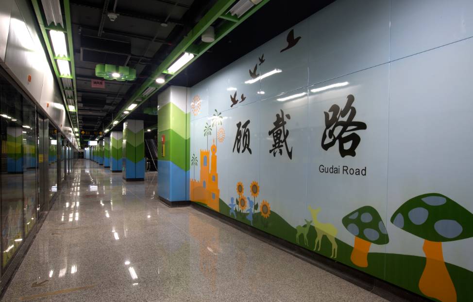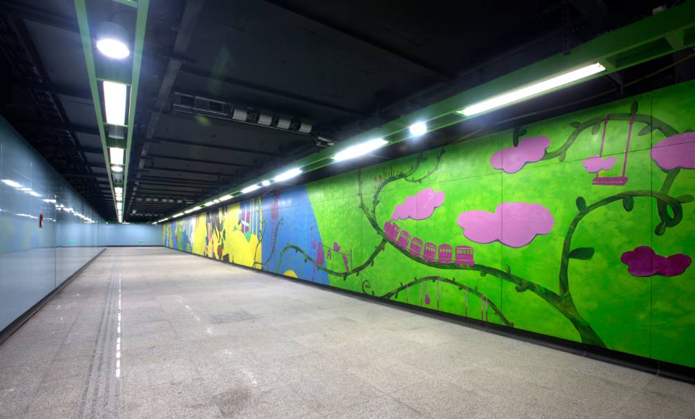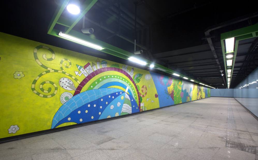 近日,在建12号线西段顾戴路站通往儿童医院出口的通道中,一幅充满童趣的涂鸦画由艺术家新鲜绘就:以花丛中的温馨女孩为视觉中心,花瓣随行、梦幻低语;两侧是巨大的冰淇淋和爬上树的小火车,夸张的艺术形式以及童话般的色彩形成舒缓清新的地铁公共环境。