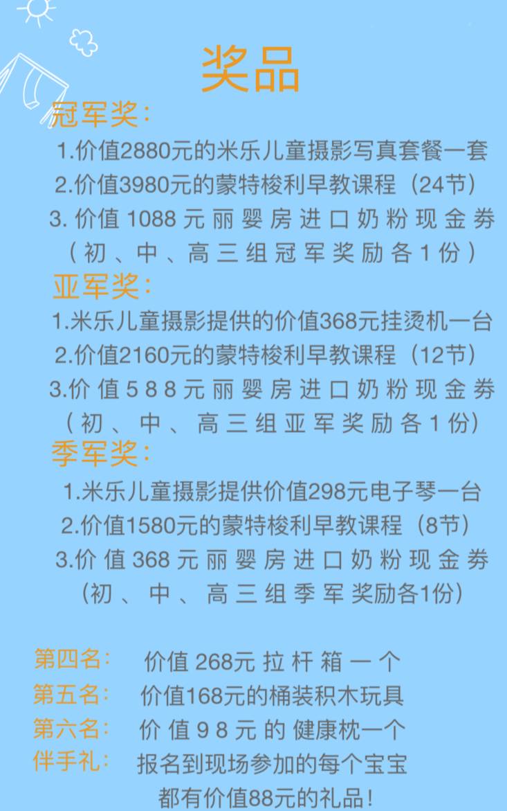 因比赛场地限制,一位宝宝仅限两位家长陪同入场,为了让宝宝有一个愉快的体验过程,请您给宝贝穿上纸尿裤,舒适的衣物及棉袜,并提前30分钟到达比赛场地活动期间,请家长照看好自己的宝宝与贵重物品 比赛期间禁止一切饮食,如宝宝需要喂食,请在休息区完成 拍照不能使用闪光灯家长自备吸引宝宝爬行的玩具