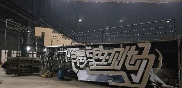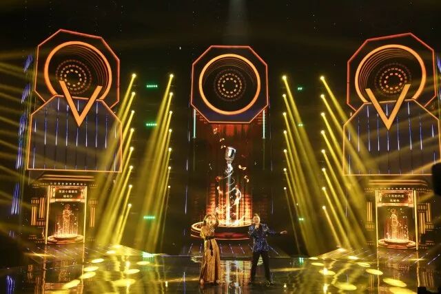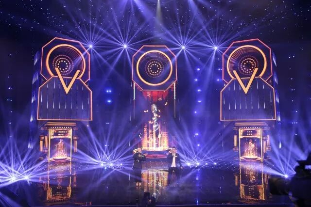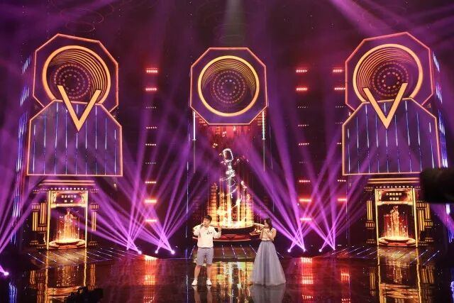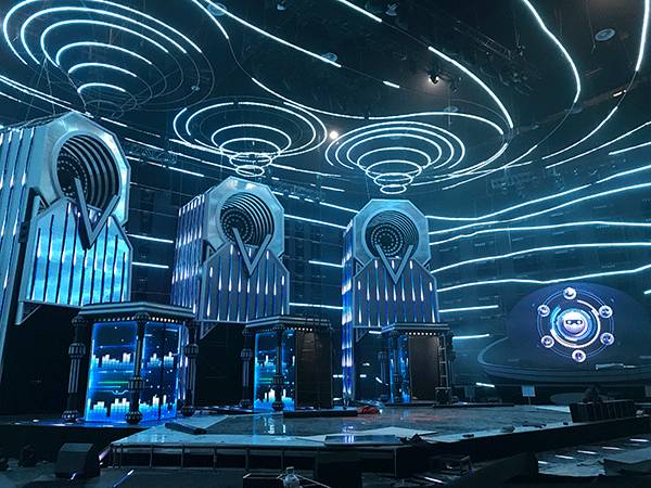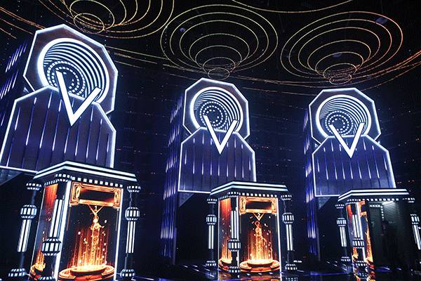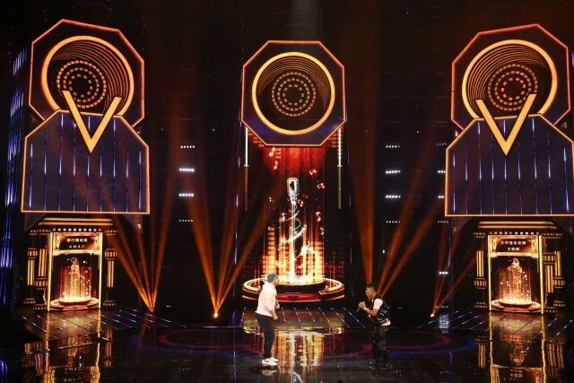 主体架构是三个带有开合和升降功能的立体大屏“歌咏亭”,后侧以音箱造型设计,供“歌咏亭”随时嵌进和推出,且每个都带有大大的“V”字logo,营造硬朗的金属工业风。与地面LED、右侧高台上的智能机器人“小渴”、左侧待定选手的高台以及音箱造型上实时打分系统界面构成整体舞台造型。