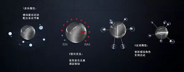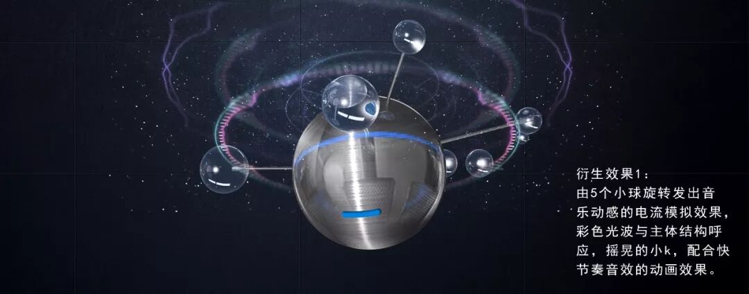 两侧“耳朵”开合来实现储藏和分析音乐,并兼有在歌手演唱时的特效、震动、节拍配合等属性。中间黑色的眼罩设计成智能音响和MP3两种质感,双重切换,配合一个音乐圆盘做承载,三维动画、特效、动力学结合孕生一个高级人工智能形象,一个专业的音乐仲裁者,一个最冷静的音乐评审大师。