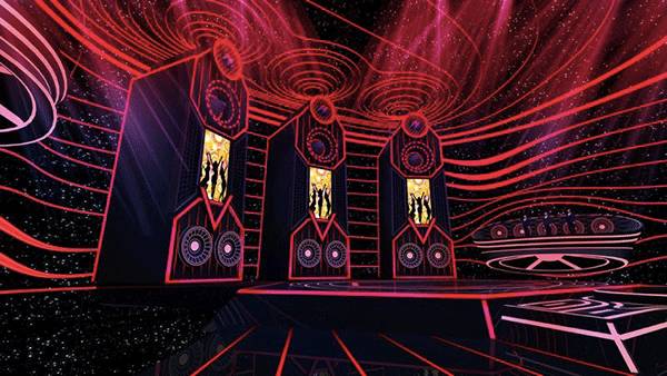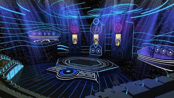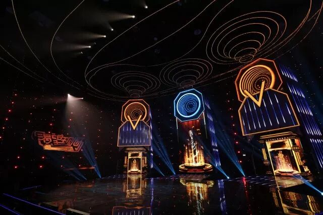 节目立意“从小盒子到大舞台”,如何将小盒子搬上大舞台,对舞美人提出了考验。设计形象上贯穿盒子、音乐和人工智能的概念,舞台后区有三个巨型盒子大音箱,音箱里面再推出三个mini盒子。选手的声音通过舞台以震撼的效果传播出去,实现他们在大舞台上尽情歌唱的梦想。另一方面人工智能的体现,节目把人工智能物质化成声波线圈的感觉,把舞台包裹在内。呈现出整体沉浸在音乐声中的感觉,大音箱释放出的声音被人工智能线圈接收,给出评分,盒子打开,实现乐迷的舞台梦想。