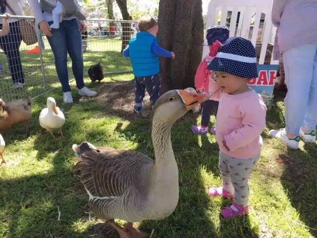 有一次我就带着孩子参加了附近社区组织的与农场动物亲密接触的活动——社区中心与一家农场合作,将牛、羊、鹅、小鸭、小鸡、兔子等动物运到了社区,围成一个小农场,小朋友们可以在家长的带领下走进这个小农场摸动物、喂动物。