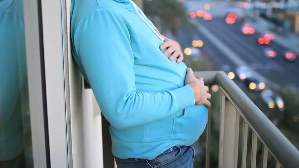 一个英俊的金发男人躺在医用轮床上,手术罩服往上掀开,露出了他鼓胀的肚皮。他的双腿被架了起来,用被单盖着。他揉着自己小腹上的体毛,突然叫了起来:“喔,我感觉到你在肚子里动了,” 他对那个幻想中的新生儿说,“你是不是很想出来?” 过了一小会,他就会 “生” 出一个小孩来,其实那就是个布娃娃,长得一点也不像人。