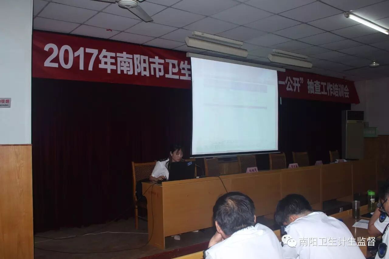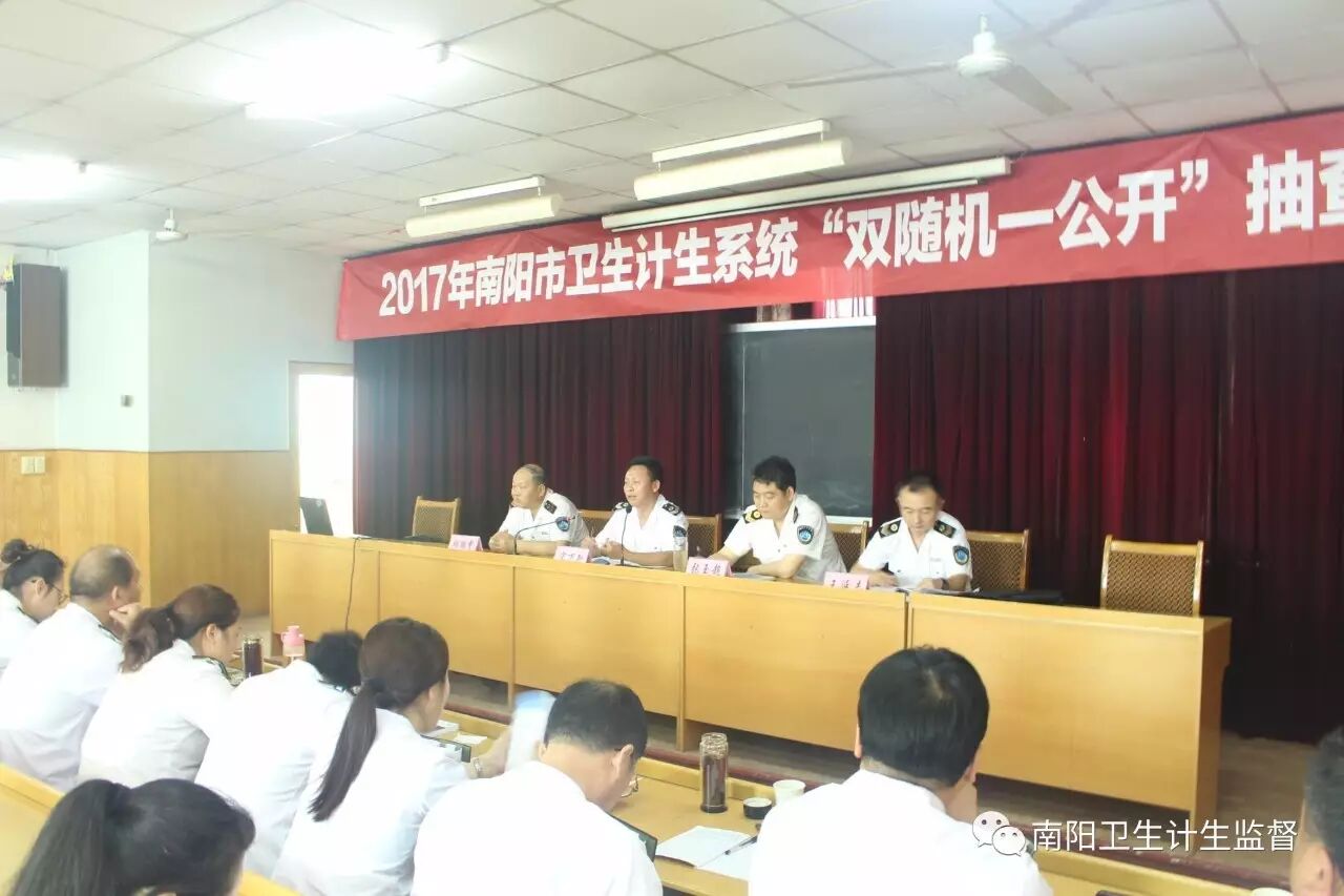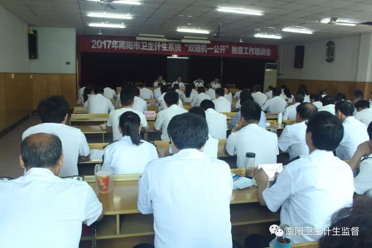为进一步推进简政放权、放管结合、优化服务,规范卫生计生执法监督行为。南阳市卫生和计划生育委员会于今日举办了2017年“双随机一公开”抽查工作培训班。市卫计委监督科宋万新科长、南阳市卫生计生监督局张玉超局长、胡鹏霄书记、王延志副局长参加了会议。参与培训的有市卫生计生监督局各业务科室主要同志、各县区卫计委监督科科长、卫生计生监督机构的主管领导、信息报告管理员及县(区)卫生监督业务骨干等80余名监督员。
