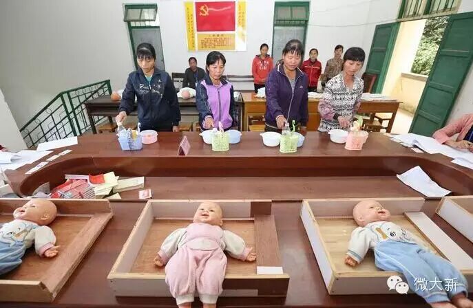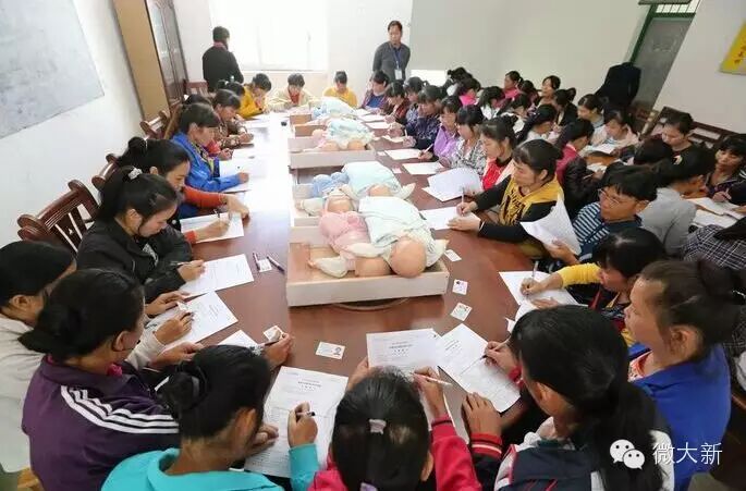 全茗镇育婴培训的学员们正在参加育婴员实际操作考试。