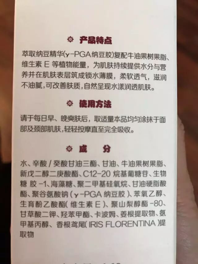 仔细看了一下里面的成分,基本是提取牛油果和纳豆,牛油果亲肤,锁水;纳豆含有聚谷氨酸钠(纳豆胶)保湿滋润,容易被吸收,可以改善肤质,是生物护肤科技的新宠。