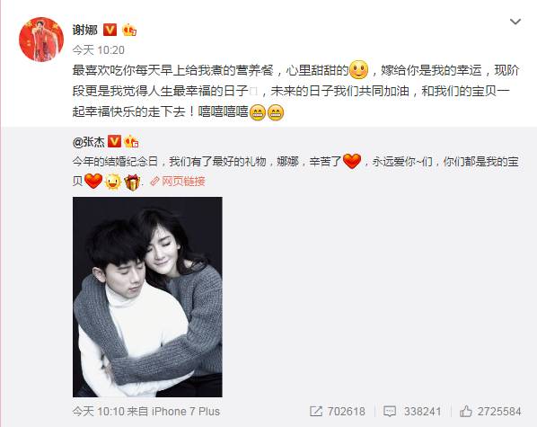 谢娜在连续消失了近三个也之后,一度被网友猜测怀孕的传闻,而这一次,谢娜终于没有再次在微博上澄清,收获了网友的祝福以后,张杰首次在微博公开且承认谢娜怀孕的实事,而谢娜随机也马上转发,并写道很长一串感谢张杰一直以来温柔体贴照顾的话。