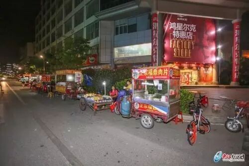 现场:从洪山文创园往长兴路走,车道左侧的夜宵摊已经排起了“长队”,只剩另一半供车辆通行。每个摊位各架在一辆红色三轮车上,车道上的可折叠木桌、塑料椅,几乎成为这条流动“小吃街”上摊贩们的标配。