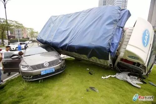 2.小车突然变道 货车刹车不及侧翻压住小车