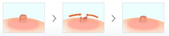 帮助扁平乳头外突的一个方法是:双手拇指分放乳头两侧,直接作用在乳头的底部,而不是乳晕的周围。两拇指冲着乳房组织用劲下压,同时外拉。这样做可以让乳头伸出来,同时也放松乳头底部的肌肉。绕着乳头的底部重复上述拉伸动作无次。