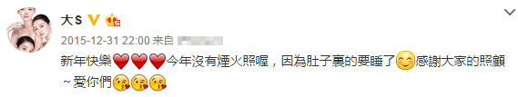 2015年12月31日,大S在微博再度宣布喜讯:“新年快乐,今年没有烟火照喔,因为肚子里的要睡了,感谢大家的照顾~爱你们。”透露自己即将迎来“1+1=4”的幸福——
