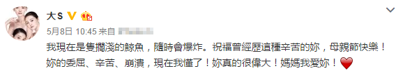 大S怀孕后期鲜少在媒体上曝光,母亲节时曾在微博透露因孕肚太大感到很不舒服,“我现在是只搁浅的鲸鱼,随时会爆炸”,哀叹现在懂了妈妈的委屈、辛苦、崩溃,“你真的很伟大!”透露出临盆前的焦虑。