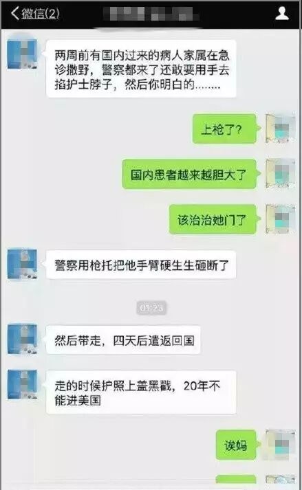 一对中国夫妻俩带孩子去美国给孩子看病,因急诊发生纠纷,于是按照国内的惯有的“处理手段”——医闹,用手掐护士脖子,后警察制服打人者,用枪托把其手臂砸断了。警方给出了两种解决方法:一、打人者在美国被起诉二级谋杀;二、打人者被遣送回国,20年内不能进美国。打人者的老婆尝试私了,被美国警方知道后逮捕,遣送回国。