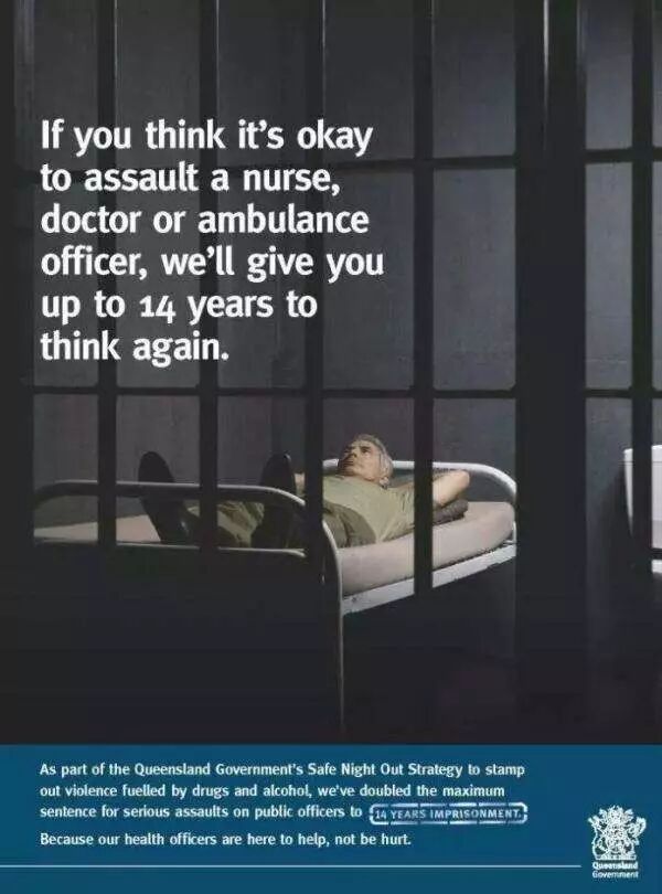 澳大利亚也是对医闹非常严厉的,下图是昆士兰州告诫医闹的海报。