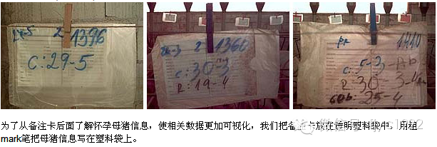 为了从备注卡后面了解怀孕母猪信息,使相关数据更加可视化,我们把备注卡放在透明塑料袋中,用粗mark笔把母猪信息写在塑料袋上。这个办法是西班牙巴塞罗那纳瓦隆猪场的Ivalin Todorov Dimitro想出来的。