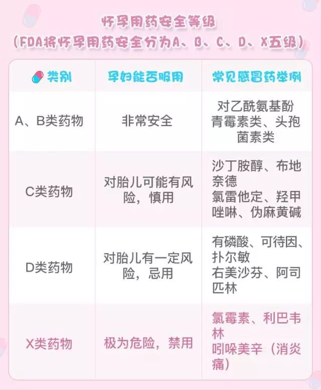 由上表可见:准妈妈尽量不要用D、X类药物,慎用C类药物,A、B类药可以安全使用。