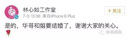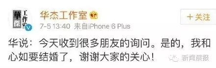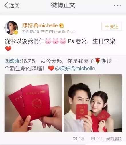 下午13:14,“一生一世”的吉时,当天生日的陈晓通过微博继续发糖,在宣布领证结婚之余,更自曝新娘子已经怀孕,他深情写道:“16.7.5,从今天起,你是我妻子。期待一个新生命的降临!”并@陈妍希。