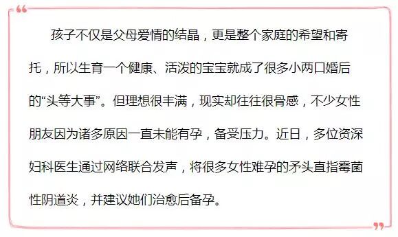 虽然霉菌性阴道炎会对女性受孕,以及胎儿发育造成一定的影响,但专家表示患者只要通过丁克泡腾片等正确药品科学治愈,是可以正常怀孕的。因此,患病的女性朋友不要过分紧张,坚持对症用药,并养成良好的卫生习惯,通过锻炼增强身体的免疫力,相信一定会好“孕”连连!