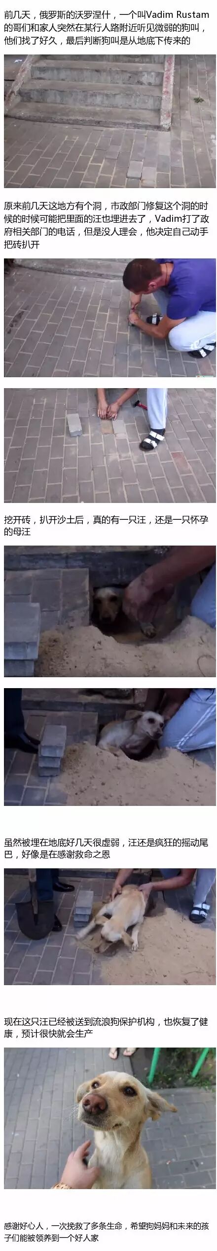 一只怀孕的汪不小心被埋在了地底,幸亏好心人听见了微弱的狗叫声,撬开了地砖,把它救了出来……