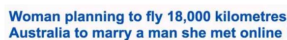 (一名女子计划飞跃18000千米的距离前往澳洲,与她在网上认识的男子结婚)