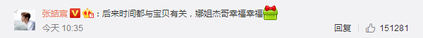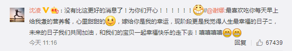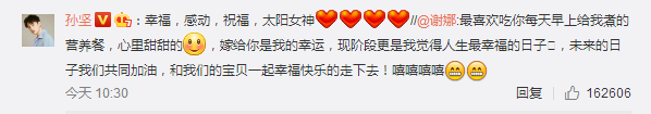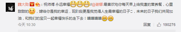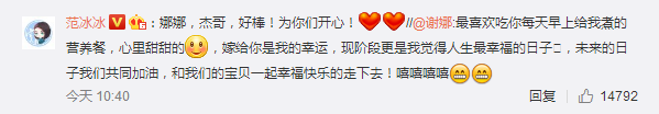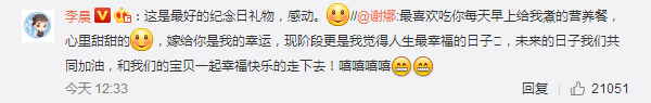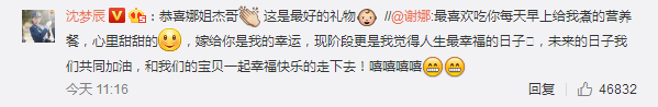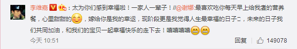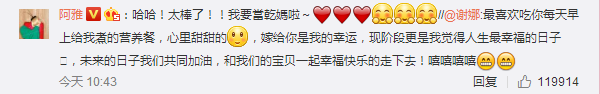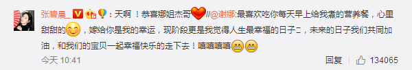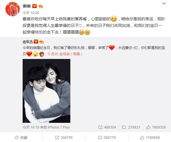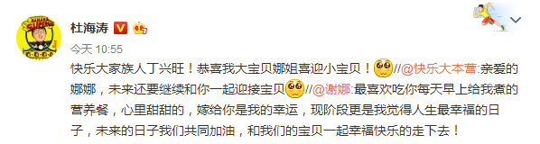 随后谢娜转发微博写道:最喜欢吃你每天早上给我煮的营养餐,心里甜甜的,嫁给你是我的幸运,现阶段更是我觉得人生最幸福的日子?,未来的日子我们共同加油,和我们的宝贝一起幸福快乐的走下去!嘻嘻嘻嘻