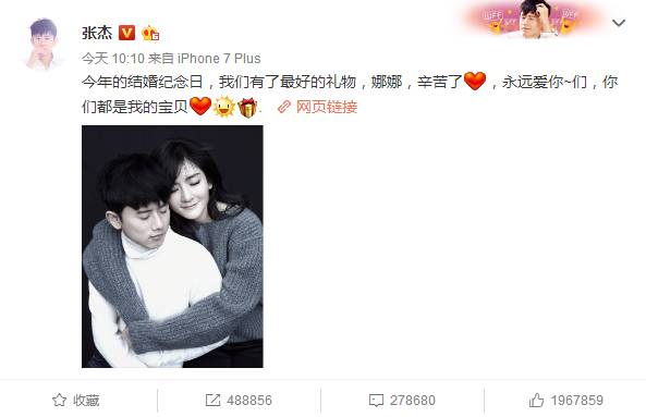张杰公布喜讯:“今年的结婚纪念日,我们有了最好的礼物,娜娜,辛苦了,永远爱你~们,你们都是我的宝贝。”