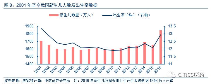 根据国家统计局的数据,2016年新生儿数量为1786万人,同比增长7.9%,但该数据为1‰人口的抽样调查数据,存在一定误差;而根据卫生计生系统根据全国住院分娩婴儿活产数统计,2016年新生儿数量为1846万人,同比增长11.5%。