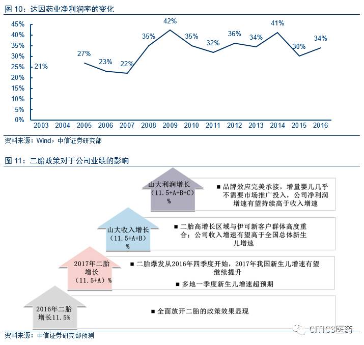 人口红利:二胎步入业绩兑现期,净利率有望继续提升。伊可新服用人群为0-3岁的婴幼儿,全面放开二胎政策下新生儿数量增长对于伊可新销量的拉动效果立竿见影,且可以持续近3年,因此公司是二胎政策最直接受益的标的。而二胎政策对于公司业绩的贡献体现在三个层次:1)卫计委数据显示2016年新生儿人数1846万人,同比+11.5%,但二胎爆发从2016Q4才刚刚开始,2017年我国新生儿增速有望较2016年进一步提升,且聊城、德州、温州等地数据显示2017Q1新生儿增速超预期;2)二胎高增长区域主要为山东、天津、上海等经济发达区域,居民消费能力较强,与伊可新客户群里高度重合,因此伊可新销量增速有望高于全国新生儿整体增速;3)新增婴儿来自于已有一孩的家庭,因此伊可新的品牌效应将完美承接,增量婴儿几乎不需要市场推广投入,公司净利润增速有望持续高于收入增速。