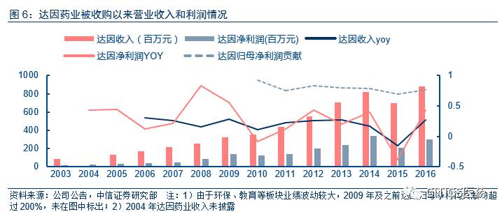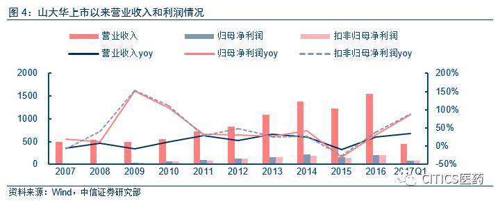 自从2010年公司剥离不良资产康诺制药后,公司医药业务完全来自于控股50.4%的达因药业。达因药业成立于1994年,2000年改制为股份公司,2003年被上市公司山大华特收购。但收购后,达因的发展一直较为缓慢,直到2007年现任山大华特副董事长、达因药业总经理杨杰全面管理达因,将业务从心血管、糖尿病、儿童药的多元并举战略聚焦为儿童药的一枝独秀。此后,达因药业步入了发展新篇章。2007-2016年,达因收入、净利润CAGR达16.83%、22.51%,归母净利润贡献长期保持在75%以上(除2015年由于取消右旋糖酐铁代理,达因业绩有所下滑)