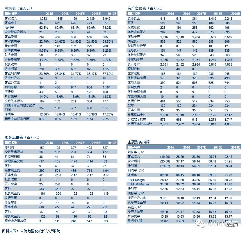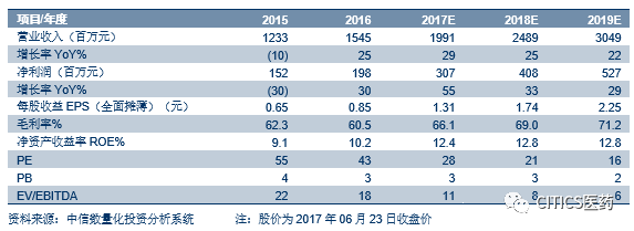 基于上述假设,我们预计公司2017/2018/2019年营业收入分别为19.91、24.89、30.49亿元,同比增长28.86%/25.06%/22.48%,毛利率分别为66.10%/69.05%/71.23%。预计公司2017/2018/2019年净利润分别为3.07/4.08/5.27亿元,考虑到除权除息带来的股本变动,调整EPS预测至1.31/1.74/2.25元。参考可比公司估值并考虑公司业绩的高成长性,给予公司2017年35倍PE,对应目标价45.85元,维持“买入”评级。