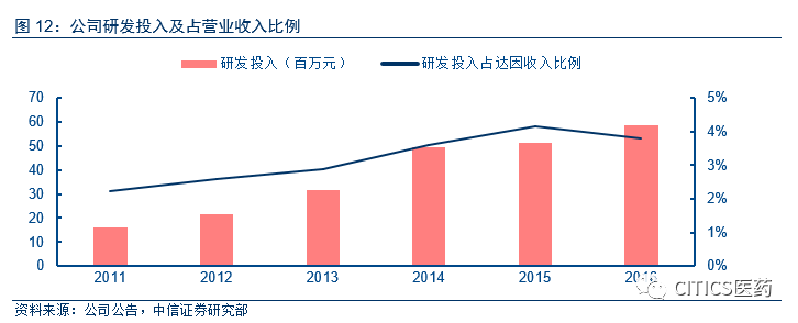 2016年,公司研发投入达5879万元,同比增长14.43%,占营业收入比例为3.81%,随着北京研究员的逐步投入运营,研发投入仍将继续提升。 目前公司有超过70个产品立项,8个品种进入药品注册程序且全部为儿童药产品。产品的陆续上市将借助公司成熟的儿童药营销渠道,实现迅速放量。