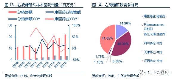 公司2009年开始独家代理了内蒙古康源药业的右旋糖酐铁口服液(后被康臣药业收购),凭借公司在儿童药领域的强大营销能力,2009-2014样本医院销量CAGR达52%,2016年市场份额为14.90%。但从2015年开始,公司被取消了康源药业的代理,专注于培育即将获批上市的更适合儿童服用的颗粒剂型,考虑到该剂型为公司独家,叠加此前成熟的营销团队(公司2014年曾将该产品销售到7000万以上规模),该产品一旦获批(预计今年下半年)有望迅速放量。由于我国儿童贫血问题严重(2岁以下儿童贫血率约为20-30%),按照此前代理康臣药业的价格估算,一个疗程约为200元(6-7盒*30元/盒),因此约3200万两岁以下儿童对应16亿左右的市场,空间巨大。