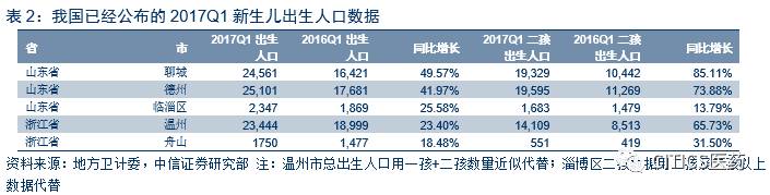 虽然2016年新生儿数量都已经是2000年以来最高出生人口的年份,但考虑到政策的传导时间和怀孕的生理周期,新增新生儿数量的爆发预计从2016年四季度才开始,2017年才会全面体现出来。从已经公布的各地区数据看,2017Q1新生儿出生数量增长显著加快,聊城和德州的新生儿数量同比增长40%以上,淄博和温州也到达了20%以上,2017年新生儿人数有望超预期增长,二胎政策红利正步入业绩兑现期。