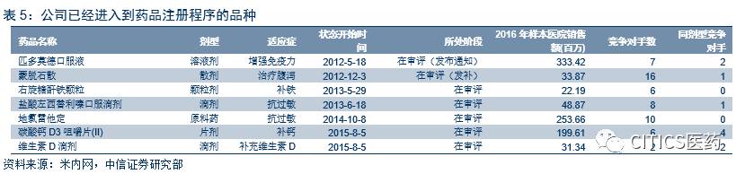 匹多莫德口服液是用于增强免疫力的药物,2016年样本医院销量为3.33亿元,公司研发的溶液剂型更适宜儿童服用,2016年样本医院销量为1.40亿元,目前仅有Doppel和长征欣凯销售。目前公司已经收到发补通知,有望于今明年获得该产品的生产批件。