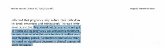 ○ 妊娠期牙齿移动速度略有减慢,但不影响矫治。这个观点与传统观点略有差异,之前我们认为,体内的激素有利于牙齿的移动,在下面的文献中提到”a little bit reduced orthodontic tooth movement“,可见即使影响也是微乎其微的。