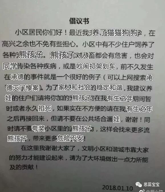 1月10日,合肥某小区里出现了这样一封“倡议书”:一位业主表示,因夫人怀孕,为了孕妇和孩子的身体健康,建议小区其他住户把自家的宠物(狗、猫…等)暂时或永久送走,等他妻子生产完毕再接回来,并且,回来以后也不要在公共场合遛狗...